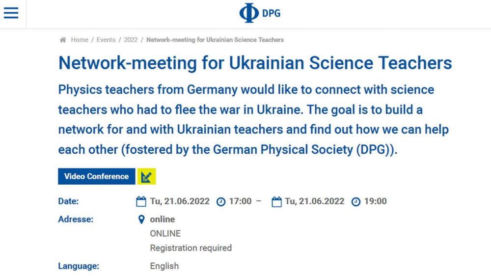 21 червня 2022 р. в онлайн-форматівідбулася зустріч вчителів фізики Німеччини з вчителями природничих наук України «Network-meeting for Ukrainian Science Teachers». Захід організували за сприяння Німецького фізичного товариства (DPG). Мета зустрічі – побудувати мережу комунікацій українських вчителів з німецькими колегами та з’ясувати, як ми можемо допомагати один одному під час війни в Україні. До обговорення долучилися викладачі фізико-математичного факультету Полтавського національного педагогічного університету імені В. Г. Короленка.