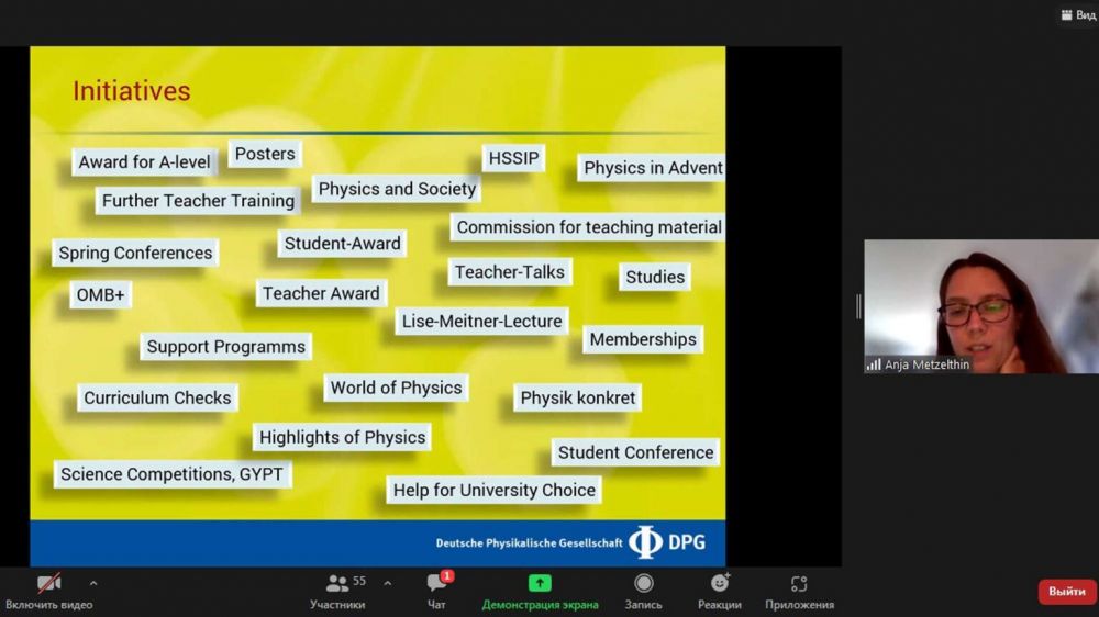 Асистент Виконавчої ради Німецького фізичного товариства Аня Мецельтін (Anja Metzelthin) у доповіді окреслила актуальні напрямки діяльності та перспективи розвитку Німецького фізичного товариства, а також висвітлила сподівання й очікування організаторів від проведення зустрічі.