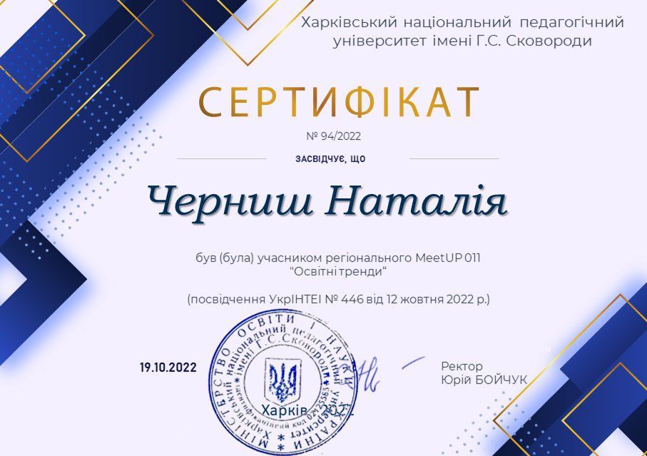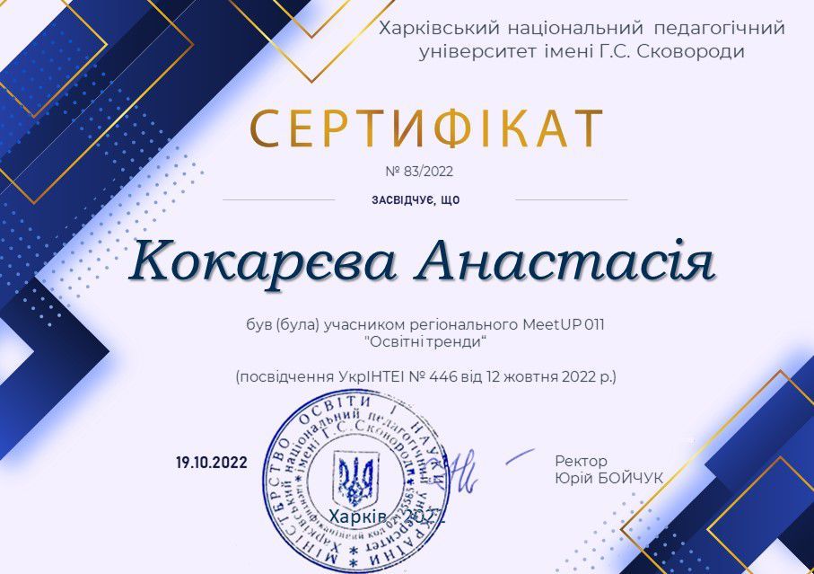 19 жовтня 2022 р. Харківський національний педагогічний університет імені Г. С. Сковороди спільно з Полтавським національним педагогічним університетом імені В. Г. Короленка та Криворізьким державним педагогічним університетом провів онлайн MeetUP для студентів, магістрантів, аспірантів, гарантів, представників груп забезпечення ОПП і ОНП спеціальності 011 Освітні, педагогічні науки «Освітні тренди».