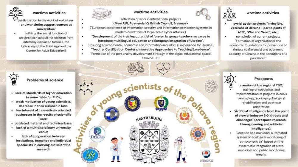 Під час характеристики діяльності молодих науковців Полтавщини у часи війни, голова РМУ ПНПУ описав участь молодих учених області в роботі волонтерських штабів при університетах та центрах підтримки постраждалих від війни; активності під виконання соціальної функції університетів (школи для дітей із внутрішньо переміщених родин, Університет третього віку та Центр освіти дорослих); активізацію роботи в міжнародних проєктах (Meet UPI, Academic IQ, British Council, Erasmus+ з такими темами, як «Європейський досвід інформаційної безпеки та систем захисту інформації в сучасних умовах масштабних кібератак», «Розвиток потенціалу підготовки учителів іноземної мови як шлях до впровадження багатомовної освіти та європейської інтеграції України», «Забезпечення екологічної, економічної та інформаційної безпеки: досвід ЄС для України», «Центри сертифікації викладачів: інноваційні підходи до досконалості викладання», «Формування стратегії розвитку особистості в цифровому освітньому просторі: Україна-ЄС» тощо. О. Лук’яненко звернув увагу на функціонування проектів соціальної дії «Нескорені. Ветерани України – учасники АТО», «Війна і Слово» тощо, а також на завершення поточних проєктів  типу «Формування організаційно-економічних засад запобігання загрозам соціально-економічній безпеці України в умовах пандемії».